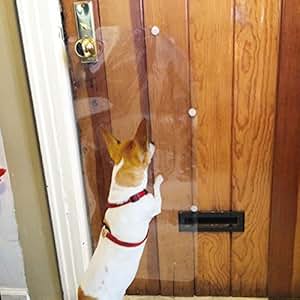Lets dog claw at door when they want to go out or come in Protects the doors without leaving marks, this protector will safe you money Clear vinyl plastic that wipes clean with damp cloth. Comes with a smooth side and a ridged noisy side. Simpler than similar products and a fraction of the price! Enter our giveaway for a chance to win one for FREE! Our pet screens are fitted with a strong claw and scratch resistant Polyester mesh.